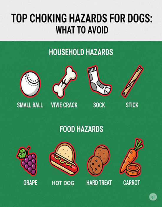 - Identify Common Hazards. Be vigilant about small toys, bones (especially cooked), sticks, rocks, inappropriate chewies, and certain human foods (like small, round items or large chunks of produce) as frequent choking in dogs culprits.