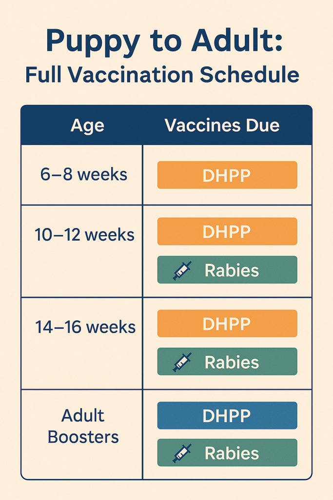 - Puppies require a series of shots starting at 6–8 weeks, with final doses around 16 weeks; adults need regular boosters to stay protected.